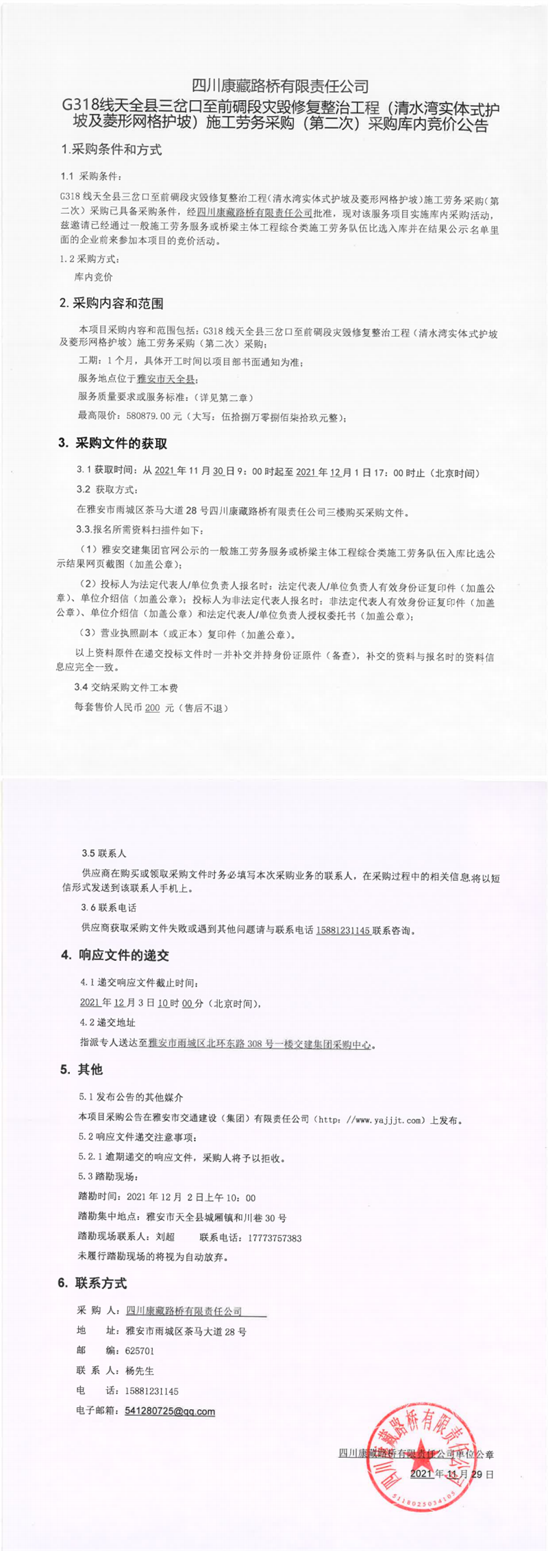 四川康藏路橋有限責任公司G318線天全縣三岔口至前碉段災(zāi)毀修復(fù)整治工程(清水灣實體式護坡及菱形網(wǎng)護坡)施工勞務(wù)采購(第二次)采購庫內(nèi)競價公告