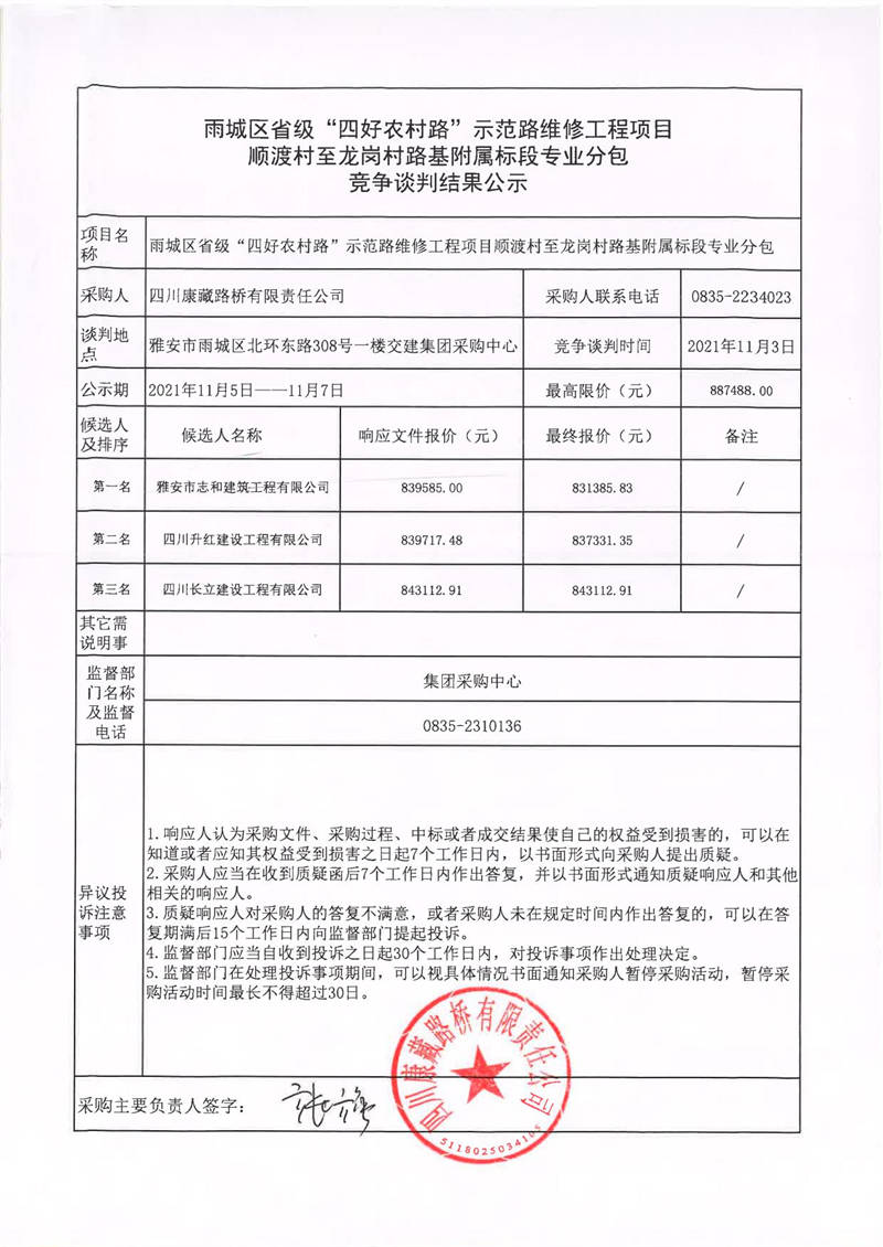 四川康藏路橋有限責任公司雨城區(qū)省級“四好農(nóng)村路”示范路維修工程項目順渡村至龍崗村路基附屬標段專業(yè)分包競爭談判結(jié)果公示
