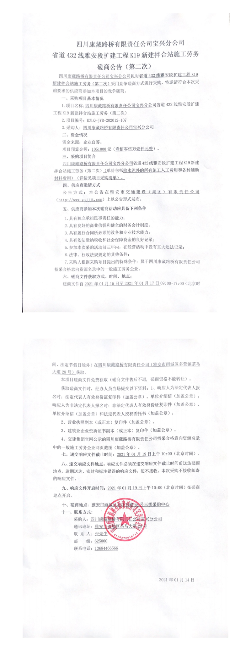 四川康藏路橋有限責任公司寶興分公司省道432線雅安段擴建工程K19新建拌合站施工勞務磋商公告(第二次)