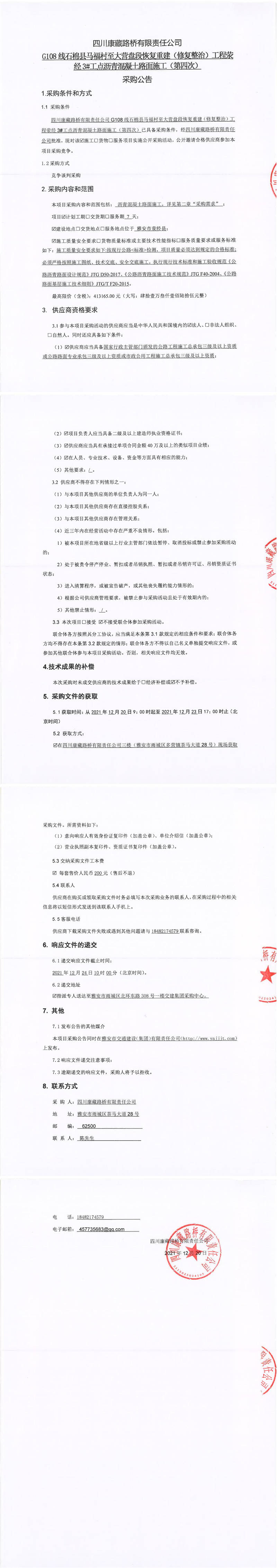 四川康藏路橋有限責任公司G108線石棉縣馬福村至大營盤段恢復重建(修復整治)工程滎經(jīng)3#工點瀝青混凝土路面施工(第四次)采購公告