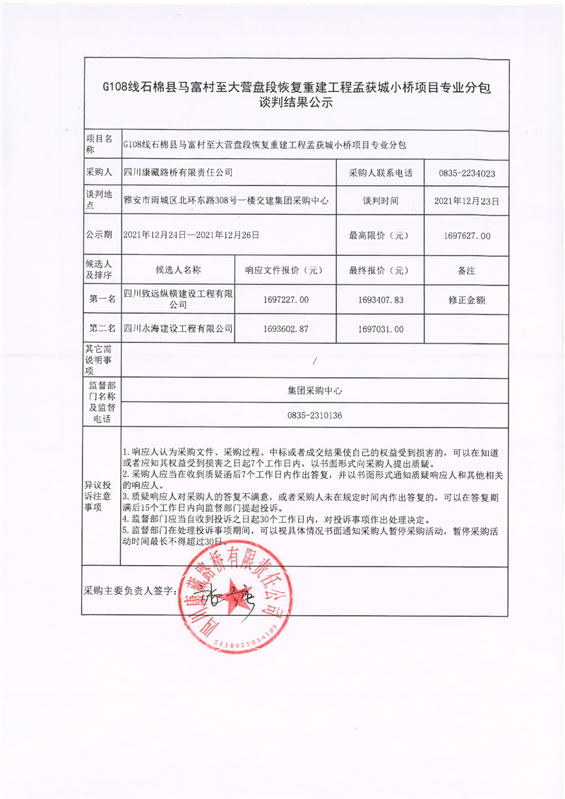 四川康藏路橋有限責(zé)任公司G108線石棉縣馬富村至大營(yíng)盤(pán)段恢復(fù)重建工程孟獲城小橋項(xiàng)目專(zhuān)業(yè)分包談判結(jié)果公示