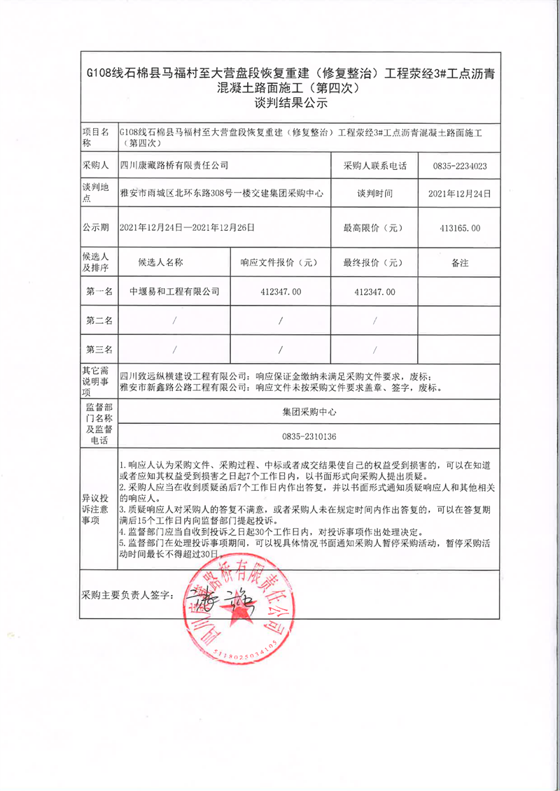 四川康藏路橋有限責任公司G108線石棉縣馬福村至大營盤段恢復重建(修復整治)工程滎經(jīng)3#工點瀝青混凝土路面施工(第四次)談判結(jié)果公示