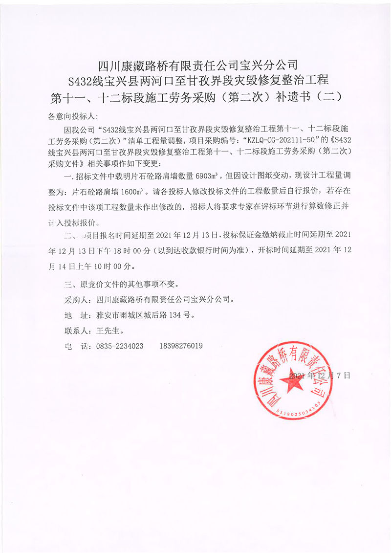 四川康藏路橋有限責(zé)任公司寶興分公司S432線寶興縣兩河口至甘孜界段災(zāi)毀修復(fù)整治工程第十一、十二標(biāo)段施工勞務(wù)采購(第二次)補遺書(二)