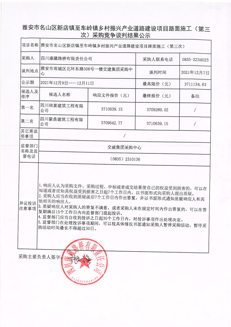 四川康藏路橋有限責(zé)任公司雅安市名山區(qū)新店鎮(zhèn)至車(chē)嶺鎮(zhèn)鄉(xiāng)村振興產(chǎn)業(yè)道路建設(shè)項(xiàng)目路面施工(第三次)采購(gòu)競(jìng)爭(zhēng)談判結(jié)果公示