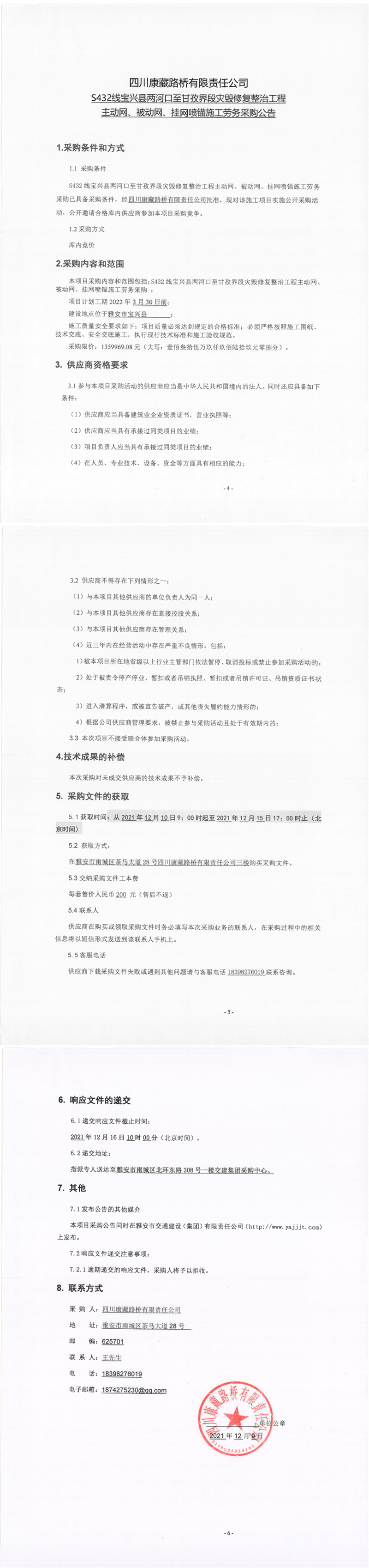 四川康藏路橋有限責任公司S432線寶興縣兩河口至甘孜界段災毀修復整治工程主動網、被動網、掛網噴錨施工勞務采購公告