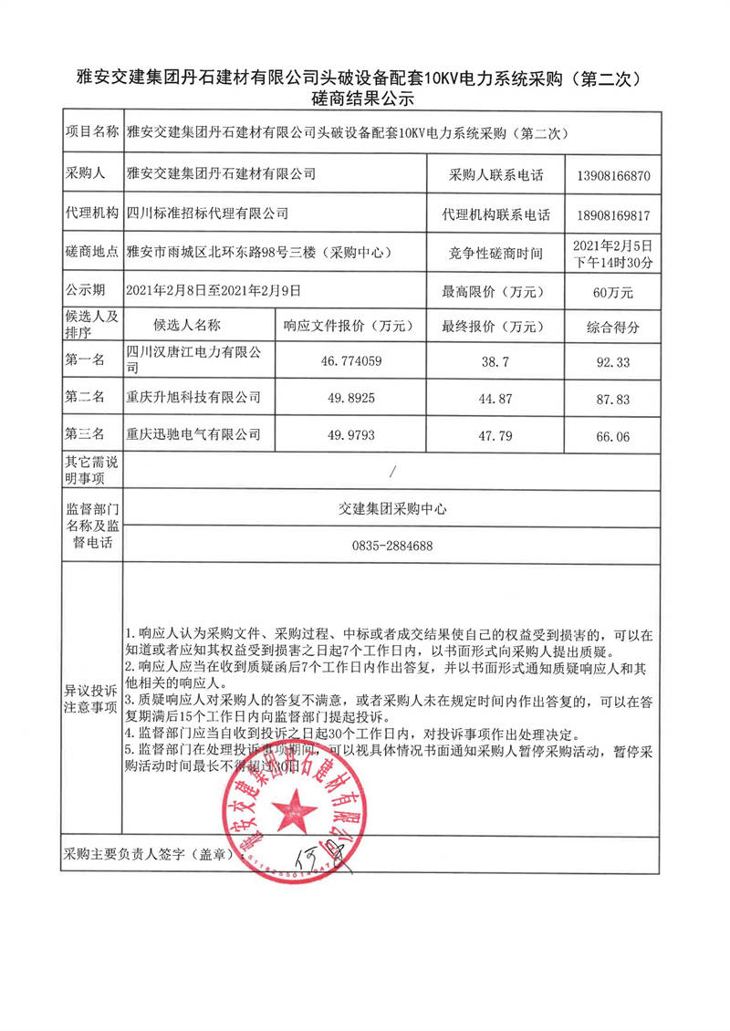 雅安交建集團(tuán)丹石建材有限公司頭破設(shè)備配套10KV電力系統(tǒng)采購(gòu)(第二次)磋商結(jié)果公示