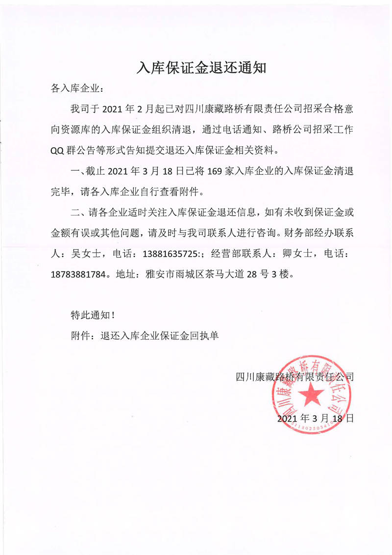 四川康藏路橋有限責(zé)任公司入庫(kù)保證金退還通知