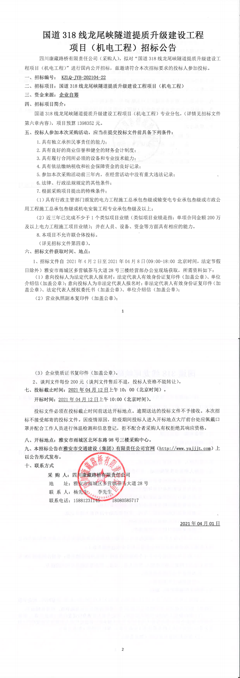 四川康藏路橋有限責(zé)任公司國道318線龍尾峽隧道提質(zhì)升級(jí)建設(shè)工程項(xiàng)目(機(jī)電工程)招標(biāo)公告