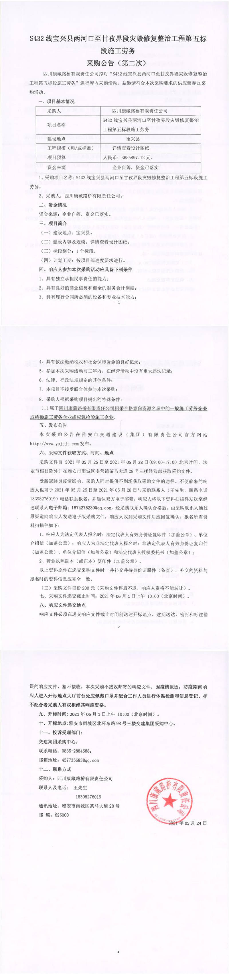 四川康藏路橋有限責(zé)任公司S432線寶興縣兩河口至甘孜界段災(zāi)毀修復(fù)整治工程第五標(biāo)段施工勞務(wù)采購(gòu)公告(第二次)