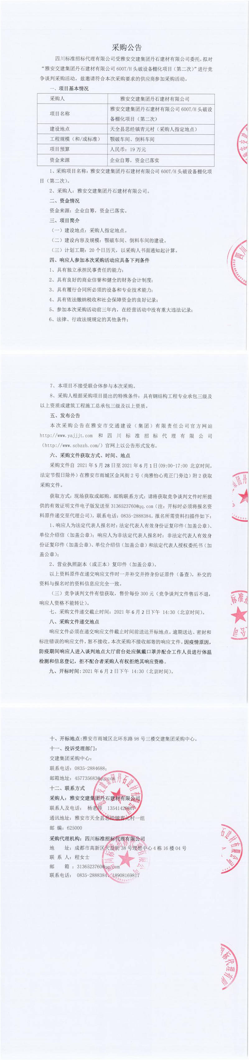 雅安交建集團(tuán)丹石建材有限公司600T/H頭破設(shè)備棚化項(xiàng)目(第二次)競爭談判公告