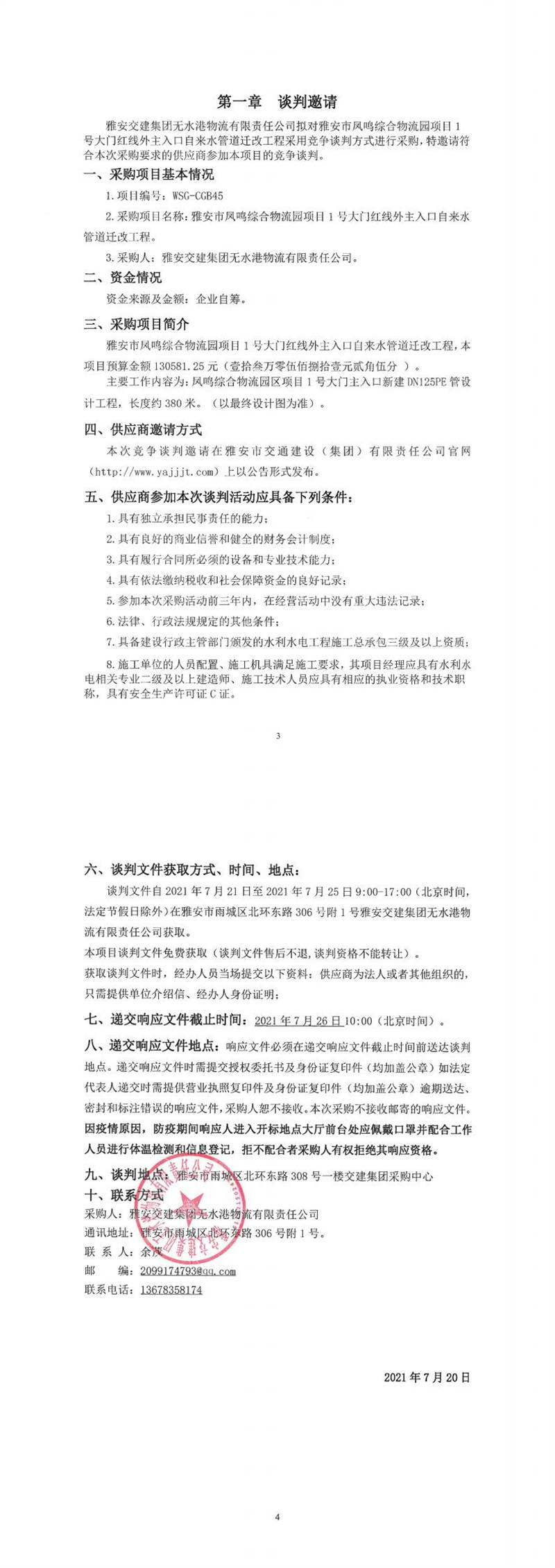 雅安交建集團(tuán)無水港物流有限責(zé)任公司雅安市鳳鳴綜合物流園項目1號大門紅線外主入口自來水管道遷改工程競爭談判公告