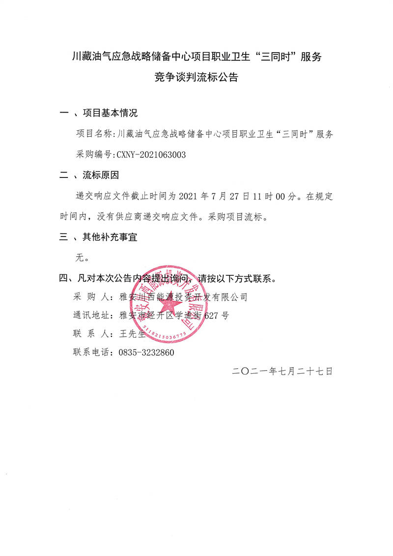 雅安川西能源投資開發(fā)有限公司川藏油氣應(yīng)急戰(zhàn)略儲備中心項目職業(yè)衛(wèi)生“三同時”服務(wù)競爭談判流標公告