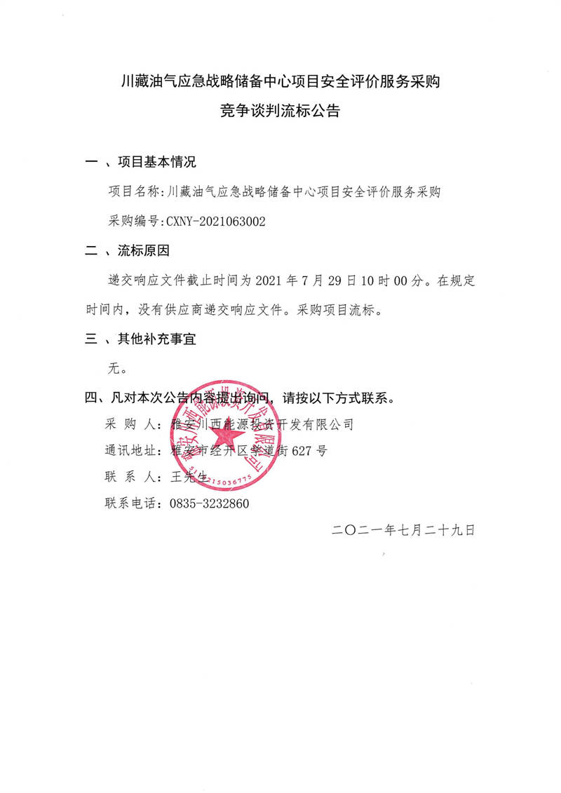 雅安川西能源投資開發(fā)有限公司川藏油氣應(yīng)急戰(zhàn)略儲備中心項(xiàng)目安全評價服務(wù)采購競爭談判流標(biāo)公告