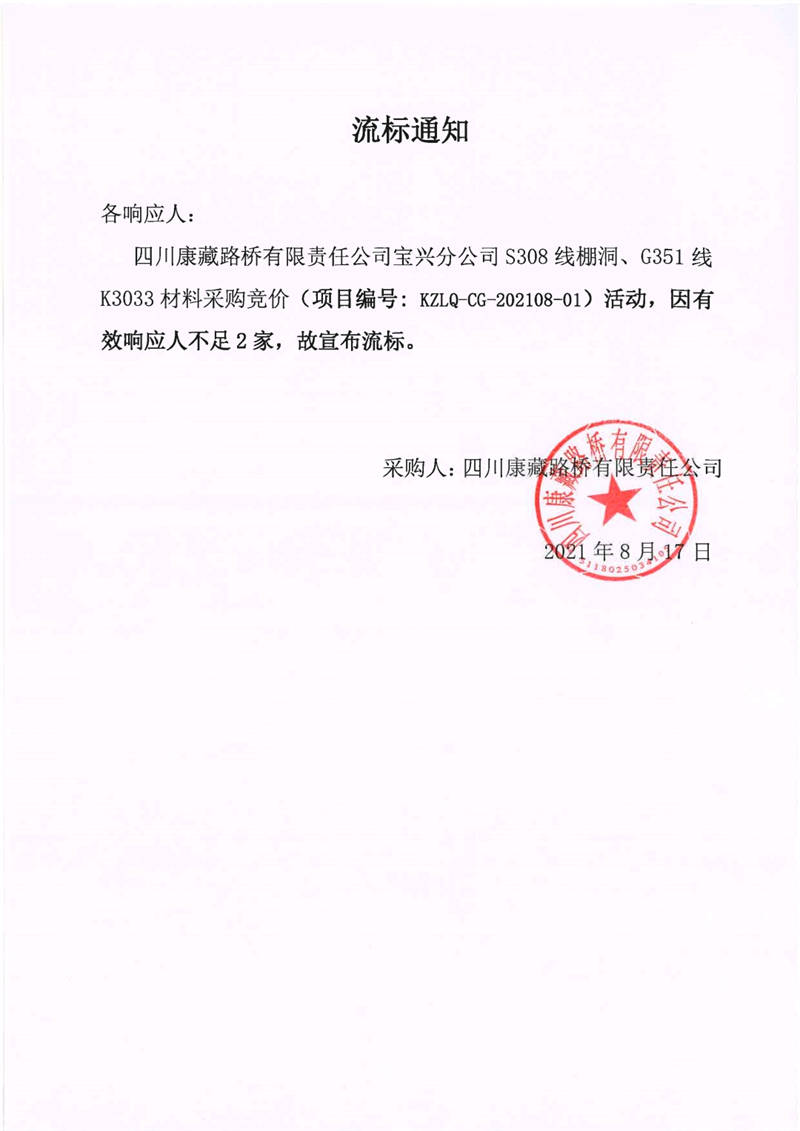 四川康藏路橋有限責(zé)任公司寶興分公司S308線棚洞、G351線K3033材料采購(gòu)競(jìng)價(jià)流標(biāo)通知