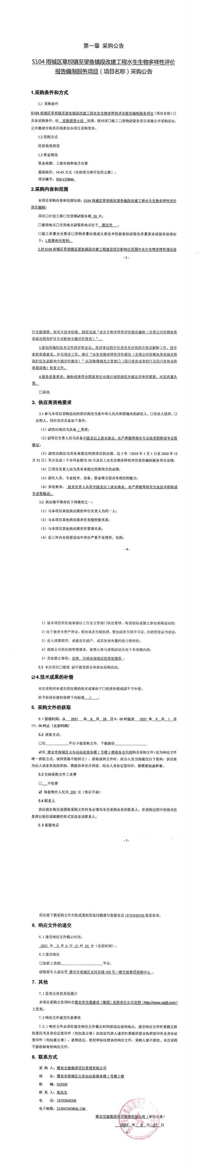 雅安交建集團項目管理有限公司S104雨城區(qū)草壩鎮(zhèn)至望魚鎮(zhèn)段改建工程水生生物多樣性評價報告編制服務(wù)項目采購公告