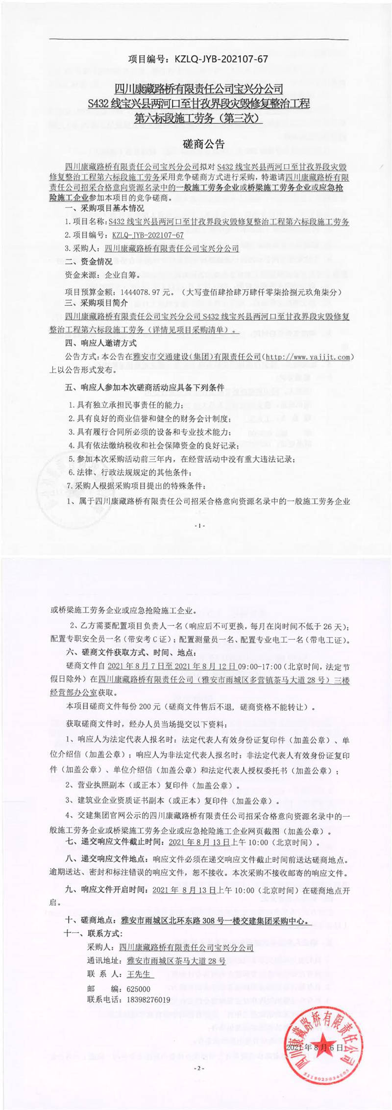 四川康藏路橋有限責(zé)任公司寶興分公司S432線寶興縣兩河口至甘孜界段災(zāi)毀修復(fù)整治工程第六標(biāo)段施工勞務(wù)(第三次)競(jìng)爭(zhēng)磋商公告