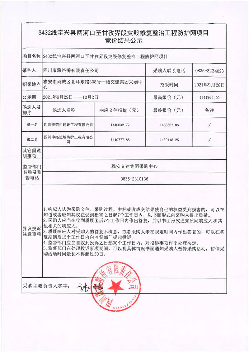四川康藏路橋有限責任公司S432線寶興縣兩河口至甘孜界段災(zāi)毀修復整治工程防護網(wǎng)項目競價結(jié)果公示