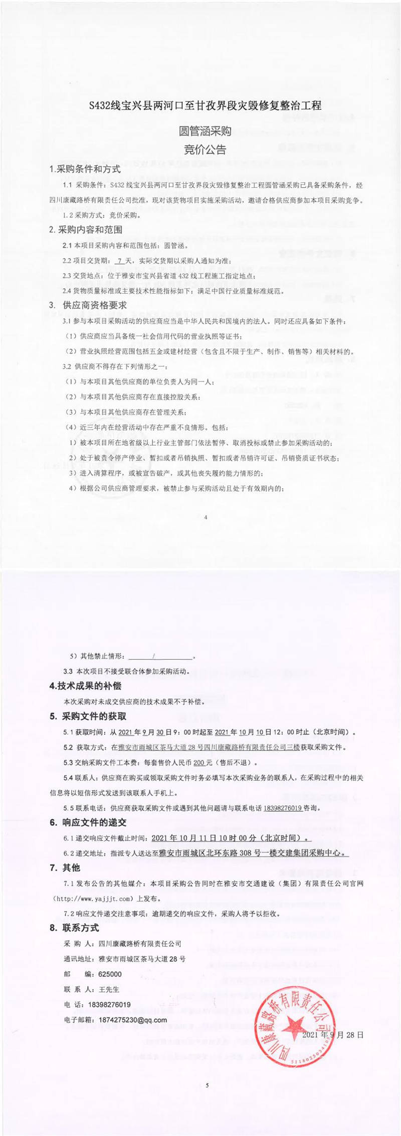 四川康藏路橋有限責(zé)任公司S432線寶興縣兩河口至甘孜界段災(zāi)毀修復(fù)整治工程圓管涵采購(gòu)競(jìng)價(jià)公告