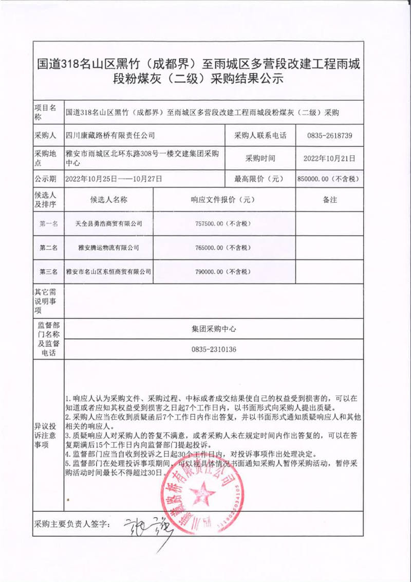 四川康藏路橋有限責(zé)任公司國道318名山區(qū)黑竹(成都界)至雨城區(qū)多營段改建工程雨城段粉煤灰(二級(jí))采購結(jié)果公示