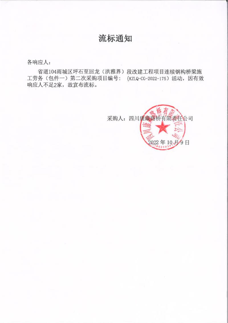 四川康藏路橋有限責(zé)任公司省道104雨城區(qū)坪石至回龍(洪雅界)段改建工程項(xiàng)目連續(xù)鋼構(gòu)橋梁施工勞務(wù)(包件一)第二次采購項(xiàng)目流標(biāo)通知