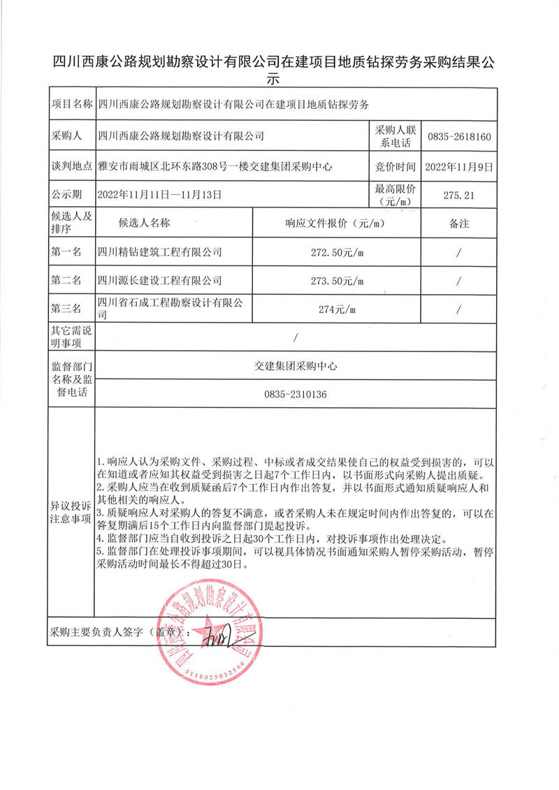 四川西康公路規(guī)劃勘察設(shè)計(jì)有限公司在建項(xiàng)目地質(zhì)鉆探勞務(wù)采購(gòu)結(jié)果公示