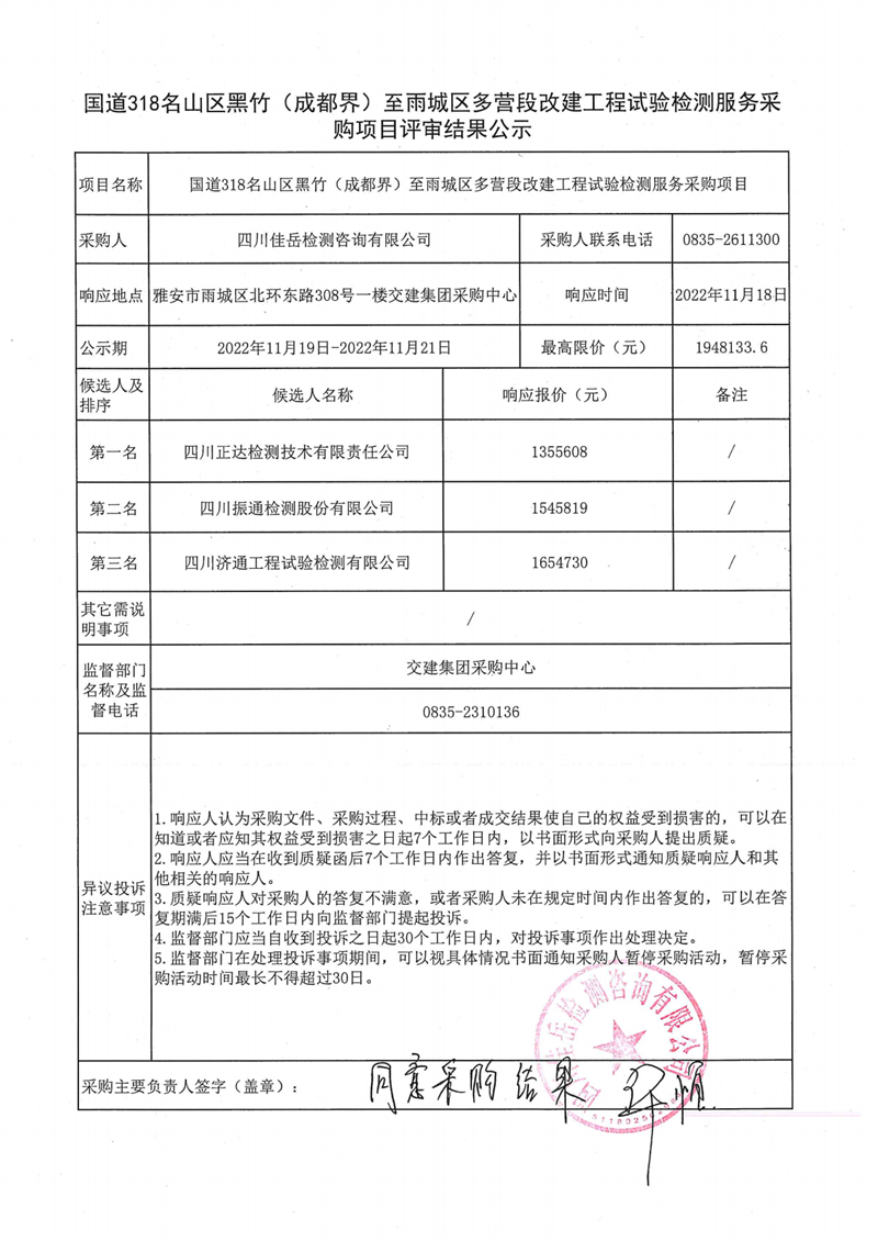四川佳岳檢測咨詢有限公司國道318名山區(qū)黑竹(成都界)至雨城區(qū)多營段改建工程試驗(yàn)檢測服務(wù)采購項(xiàng)目評審結(jié)果公示