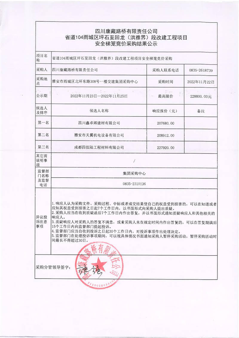 四川康藏路橋有限責任公司省道104雨城區(qū)坪石至回龍(洪雅界)段改建工程項目安全梯籠競價采購結(jié)果公示