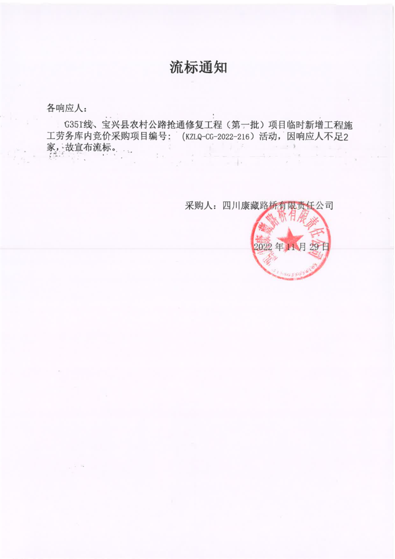 四川康藏路橋有限責(zé)任公司G351線、寶興縣農(nóng)村公路搶通修復(fù)工程(第一批)項(xiàng)目臨時(shí)新增工程施工勞務(wù)庫(kù)內(nèi)競(jìng)價(jià)采購(gòu)流標(biāo)通知