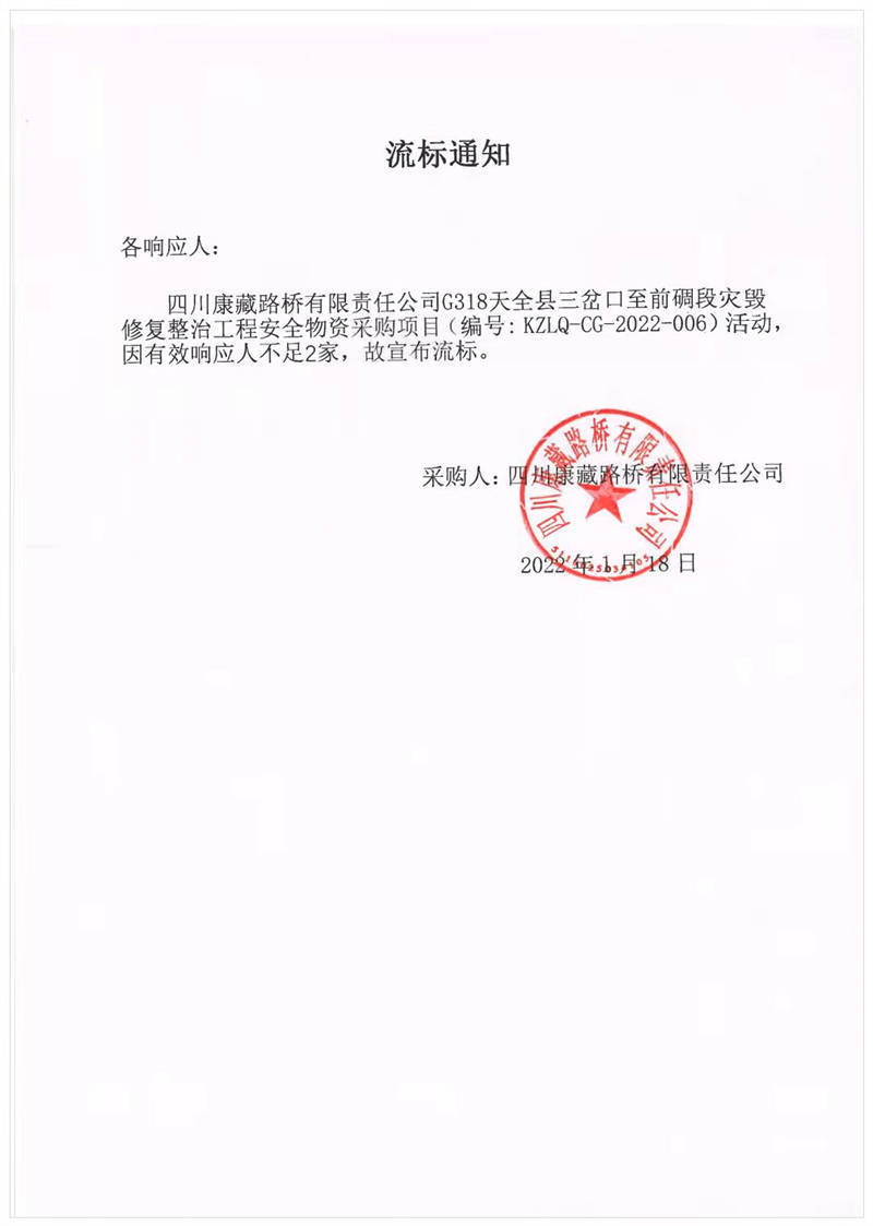 四川康藏路橋有限責任公司G318天全縣三岔口至前碉段災毀修復整治工程安全物資采購項目流標通知