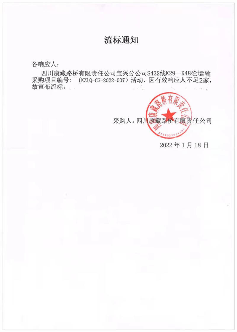 四川康藏路橋有限責(zé)任公司寶興分公司S432線K29-K48砼運輸采購項目流標通知