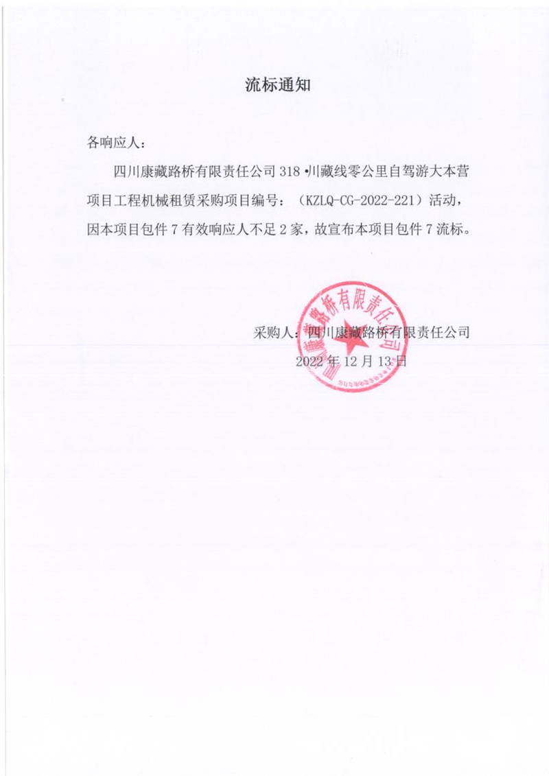 四川康藏路橋有限責(zé)任公司318.川藏線零公里自駕游大本營項目工程機械租賃采購(包件7)流標(biāo)通知