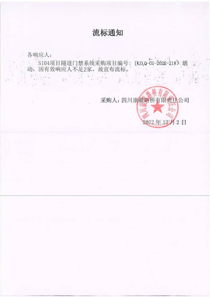 四川康藏路橋有限責(zé)任公司S104項目隧道門禁系統(tǒng)流標(biāo)通知