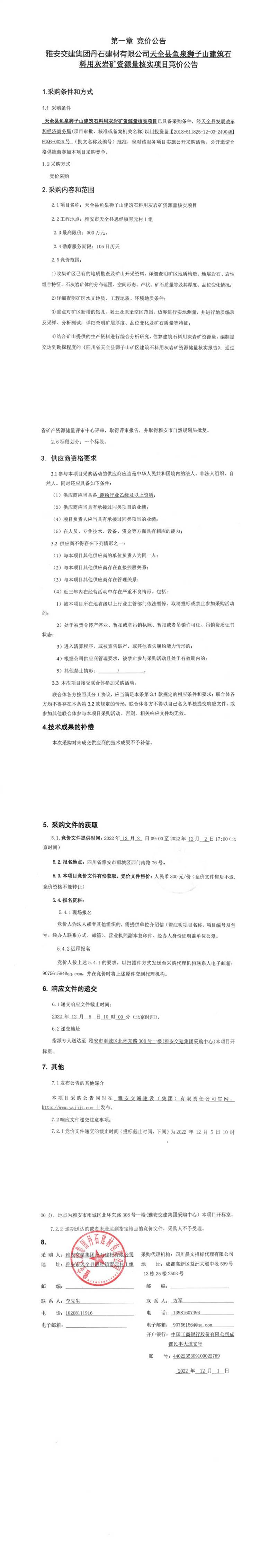 雅安交建集團丹石建材有限公司天全縣魚泉獅子山建筑石料用灰?guī)r礦資源量核實項目競價公告