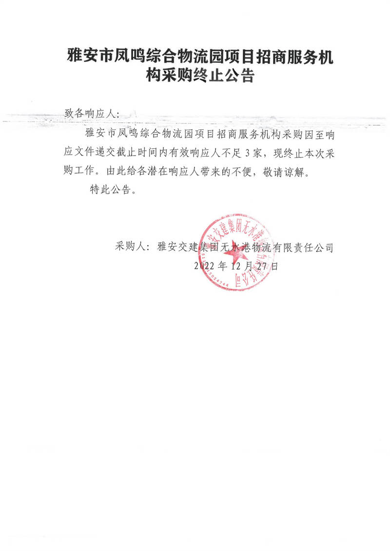雅安交建集團(tuán)無水港物流有限責(zé)任公司雅安市鳳鳴綜合物流園項目招商服務(wù)機(jī)構(gòu)采購終止公告