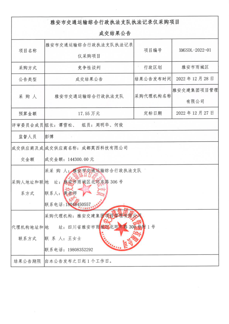雅安交建集團項目管理有限公司雅安市交通運輸綜合行政執(zhí)法支隊執(zhí)法記錄儀采購項目成交結(jié)果公告