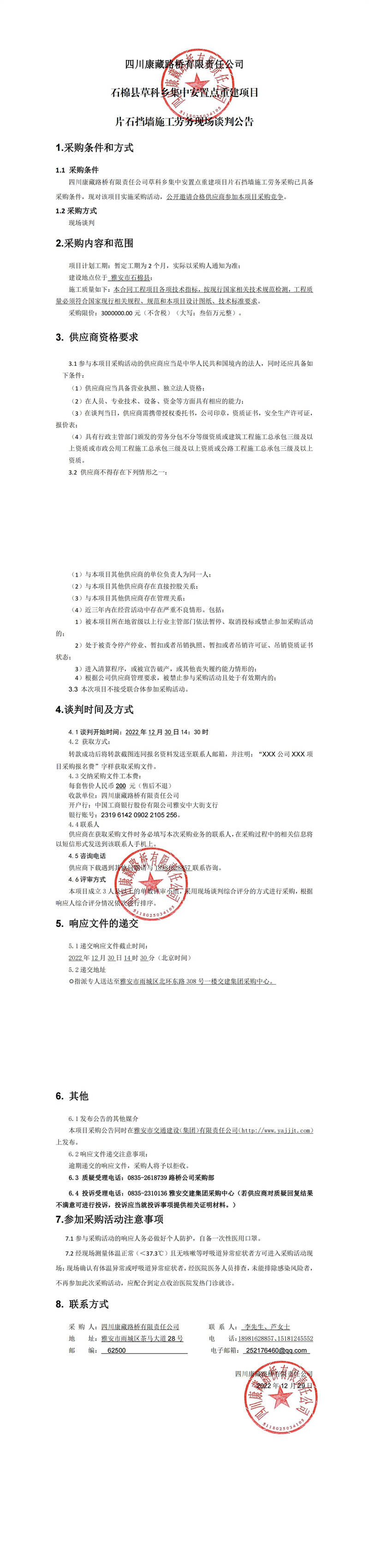 四川康藏路橋有限責任公司石棉縣草科鄉(xiāng)集中安置點重建項目片石擋墻施工勞務現(xiàn)場談判公告
