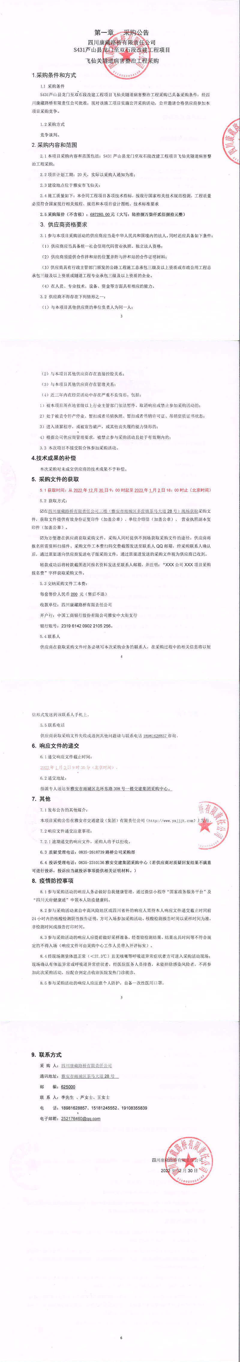 四川康藏路橋有限責(zé)任公司S431蘆山縣龍門至雙石段改建工程項(xiàng)目飛仙關(guān)隧道病害整治工程采購(gòu)采購(gòu)公告