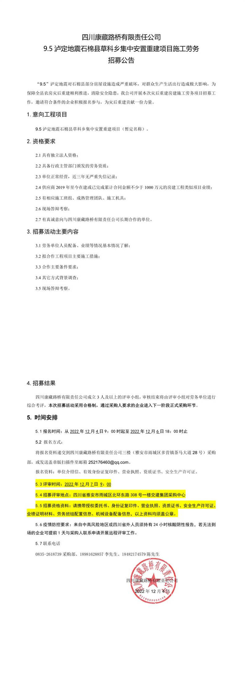四川康藏路橋有限責(zé)任公司9.5瀘定地震石棉縣草科鄉(xiāng)集中安置重建項目施工勞務(wù)招募公告