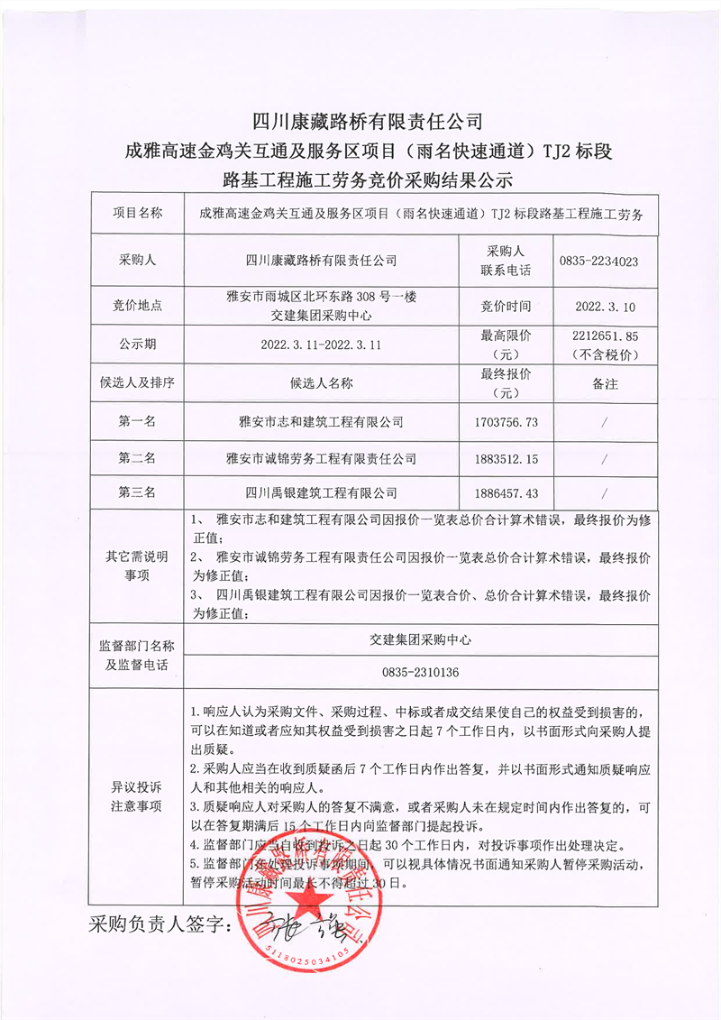 四川康藏路橋有限責(zé)任公司成雅高速金雞關(guān)互通及服務(wù)區(qū)項(xiàng)目(雨名快速通道)TJ2標(biāo)段路基工程施工勞務(wù)競(jìng)價(jià)采購(gòu)結(jié)果公示
