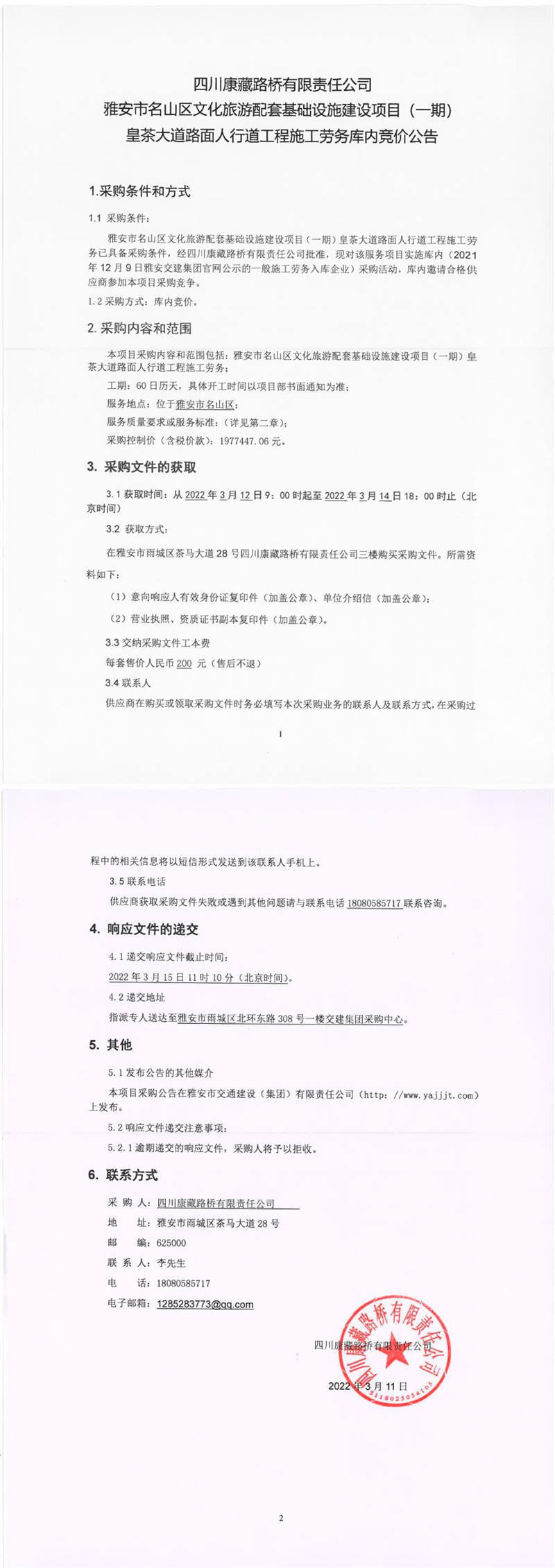 四川康藏路橋有限責(zé)任公司雅安市名山區(qū)文化旅游配套基礎(chǔ)設(shè)施建設(shè)項(xiàng)目(一期)皇茶大道路面人行道工程施工勞務(wù)庫(kù)內(nèi)競(jìng)價(jià)公告