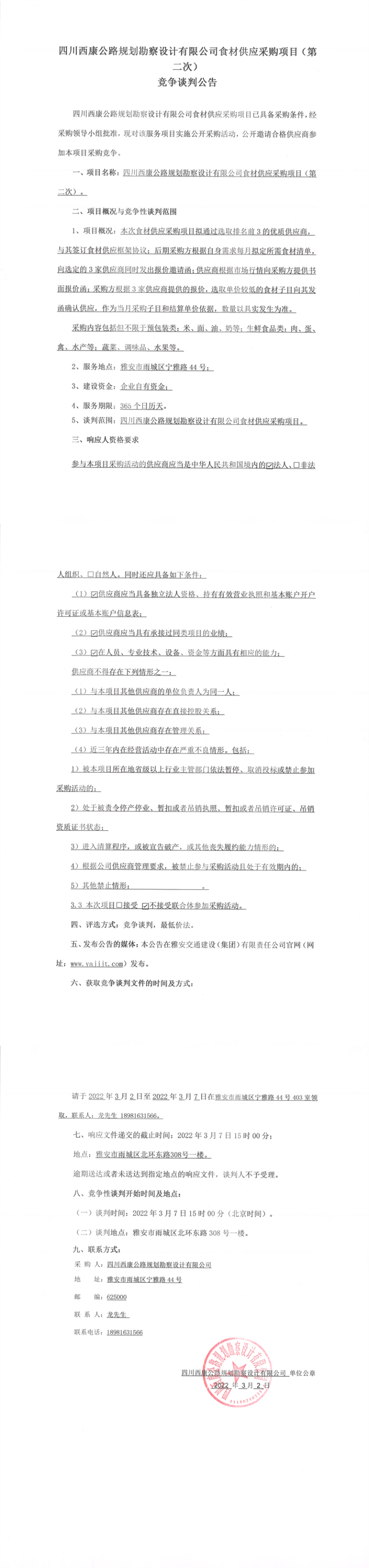 四川西康公路規(guī)劃勘察設(shè)計(jì)有限公司食材供應(yīng)采購項(xiàng)目(第二次)競(jìng)爭(zhēng)談判公告