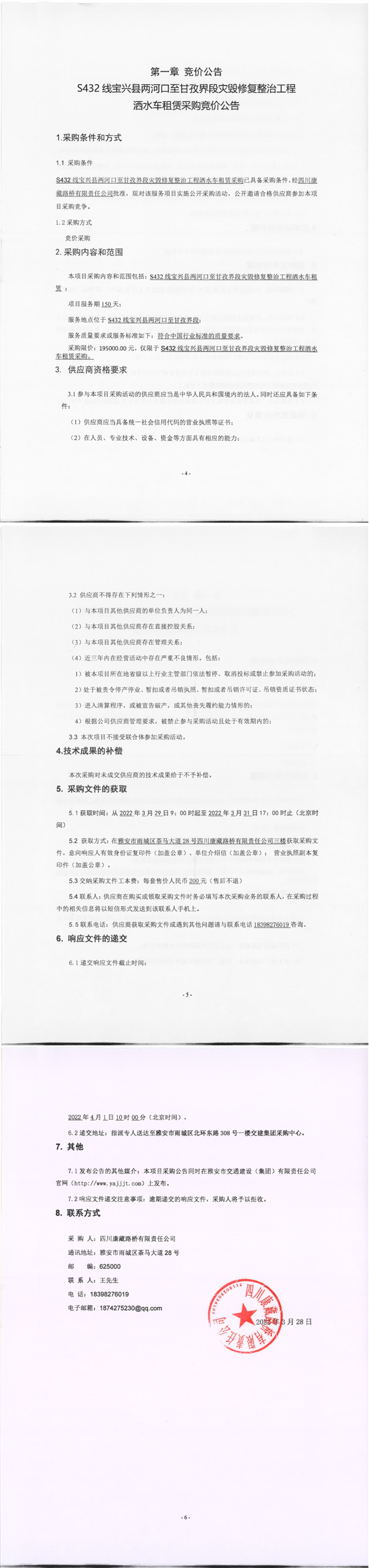 四川康藏路橋有限責任公司S432線寶興縣兩河口至甘孜界段災毀修復整治工程灑水車租賃采購競價公告