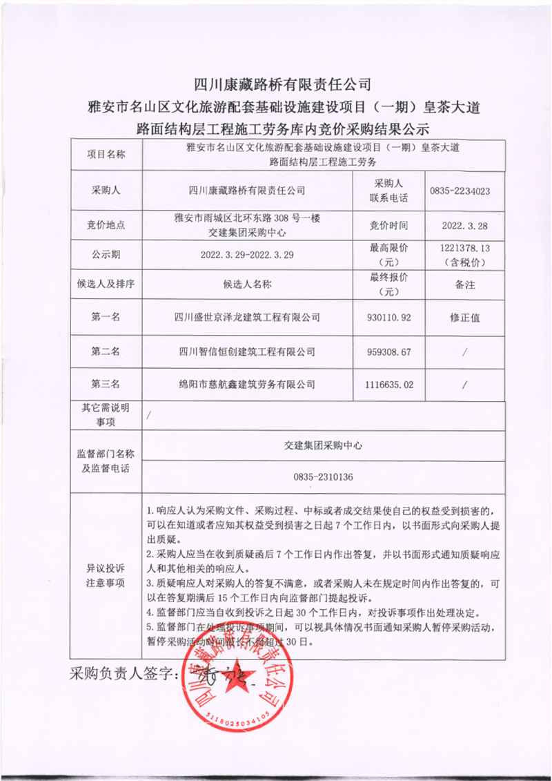 四川康藏路橋有限責任公司雅安市名山區(qū)文化旅游配套基礎設施建設項目(一期)路面結構層工程施工勞務庫內競價采購結果公示