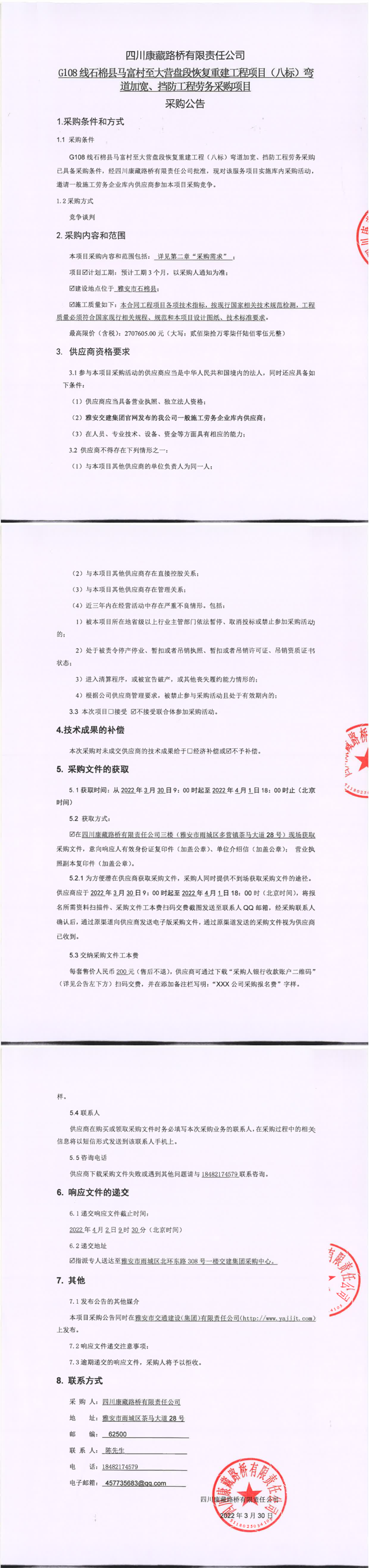 四川康藏路橋有限責(zé)任公司G108線石棉縣馬富村至大營(yíng)盤(pán)段恢復(fù)重建工程(八標(biāo))彎道加寬、擋防工程勞務(wù)采購(gòu)項(xiàng)目采購(gòu)公告