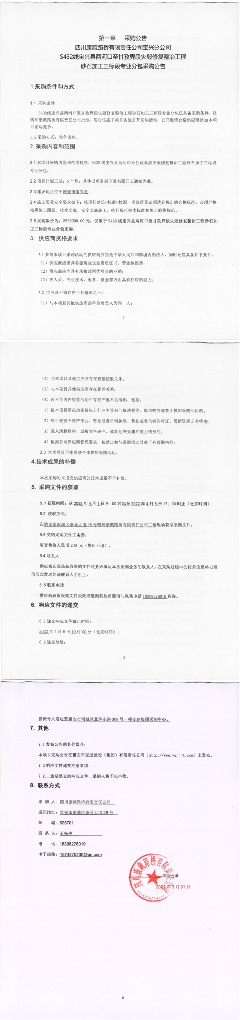 四川康藏路橋有限責(zé)任公司S432線寶興縣兩河口至甘孜界段災(zāi)毀修復(fù)整治工程砂石加工三標(biāo)段專業(yè)分包采購(gòu)公告