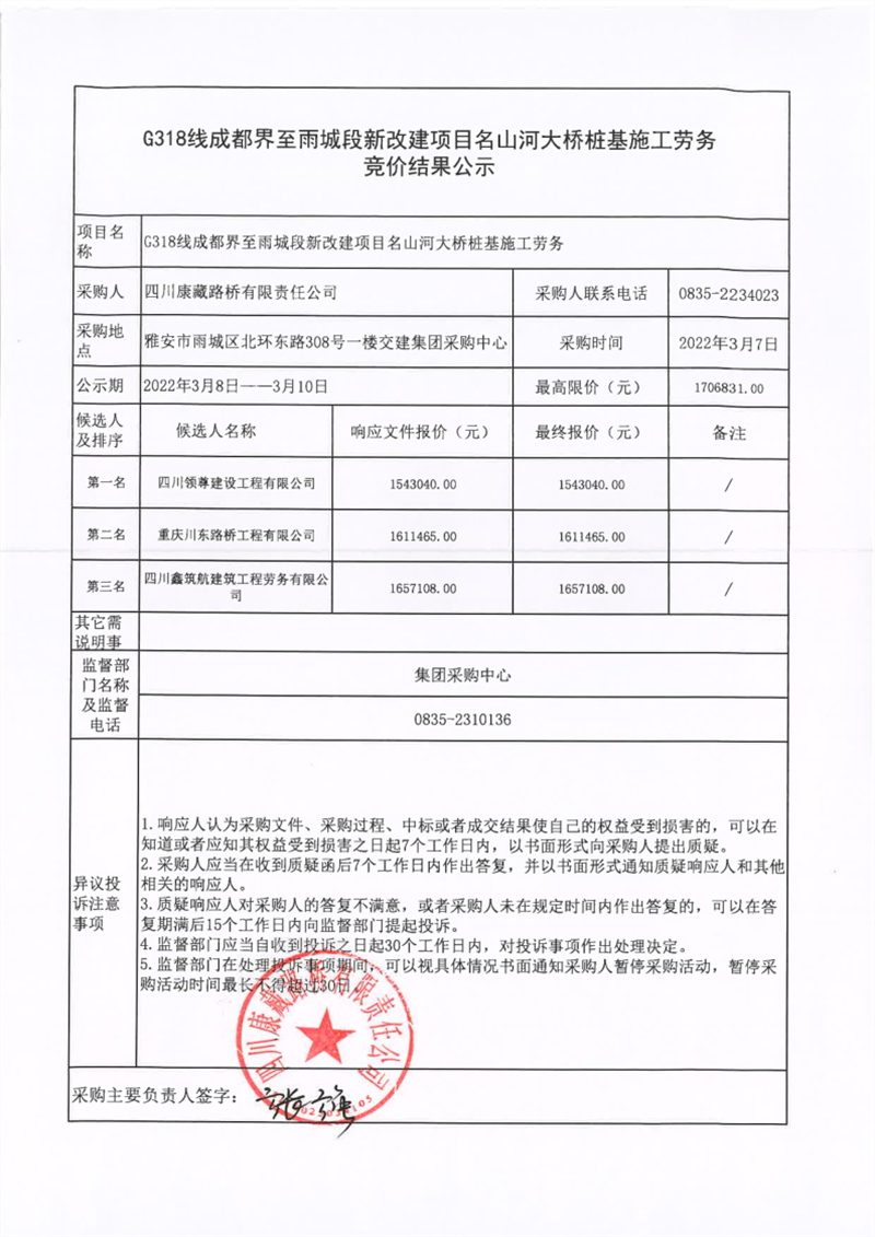 四川康藏路橋有限責(zé)任公司G318線成都界至雨城段新改建項(xiàng)目名山河大橋樁基施工勞務(wù)競價(jià)結(jié)果公示
