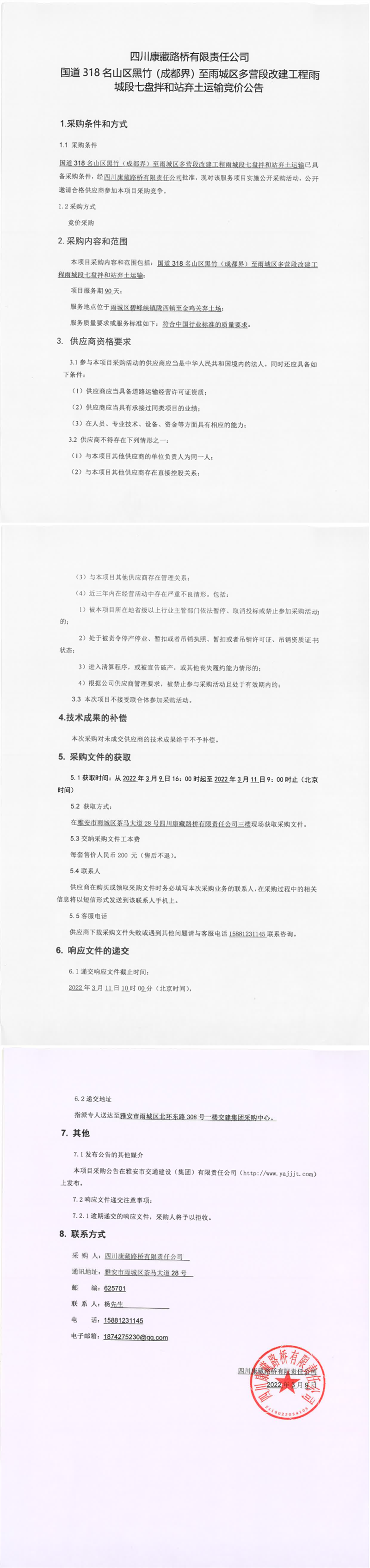 四川康藏路橋有限責(zé)任公司國道318名山區(qū)黑竹(成都界)至雨城區(qū)多營段改建工程雨城段七盤拌和站棄土運(yùn)輸競價公告
