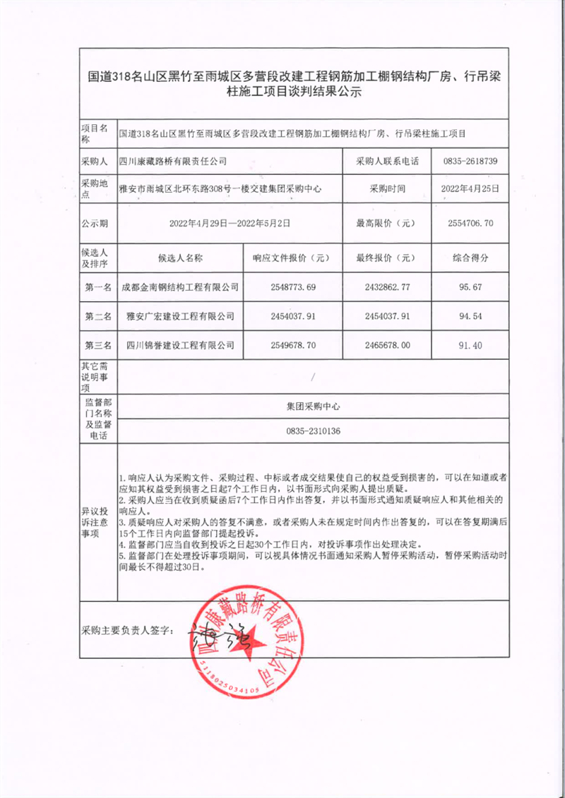 四川康藏路橋有限責(zé)任公司國道318名山區(qū)黑竹至雨城區(qū)多營段改建工程鋼筋加工棚鋼結(jié)構(gòu)廠房、行吊梁柱施工項(xiàng)目談判結(jié)果公示