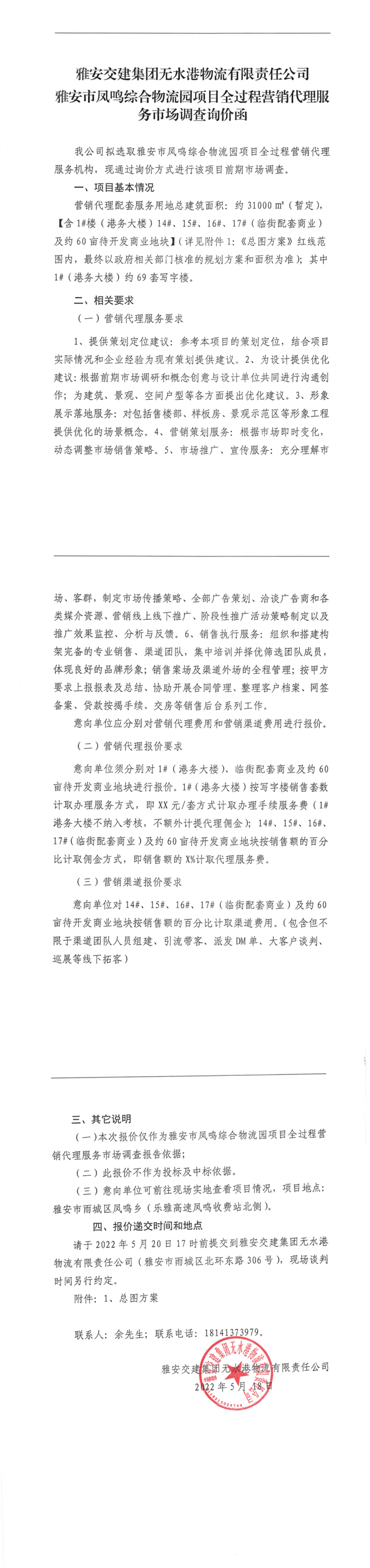 雅安交建集團無水港物流有限責任公司雅安市鳳鳴綜合物流園項目全過程營銷代理服務(wù)市場調(diào)查詢價函