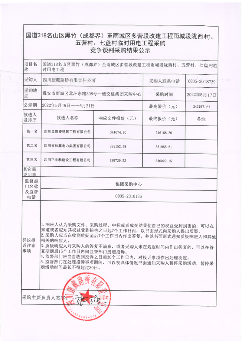 四川康藏路橋有限責(zé)任公司國(guó)道318名山區(qū)黑竹(成都界)至雨城區(qū)多營(yíng)段改建工程雨城段隴西村、五營(yíng)村、七盤(pán)村臨時(shí)用電工程采購(gòu)競(jìng)爭(zhēng)談判結(jié)果公示